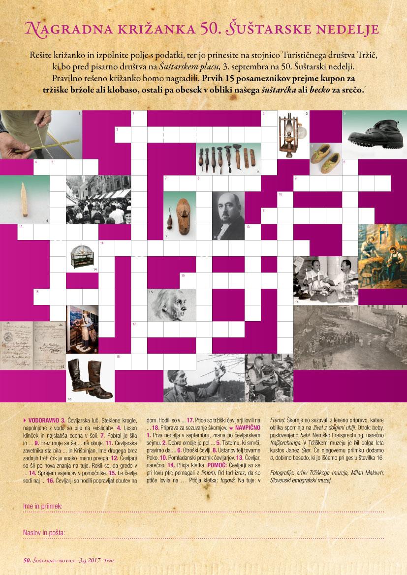 Rešite križanko in izpolnite polje s podatki. Prinesite jo na stojnico Turističnega društva Tržič, ki bo pred pisarno društva na Šuštarskem placu, 3. septembra na 50. Šuštarski nedelji. Pravilno rešeno križanko bomo nagradili. Prvih 15 posameznikov prejme kupon za tržiške bržole ali klobaso, ostali pa obesek v obliki našega šuštarčka ali becko za srečo.