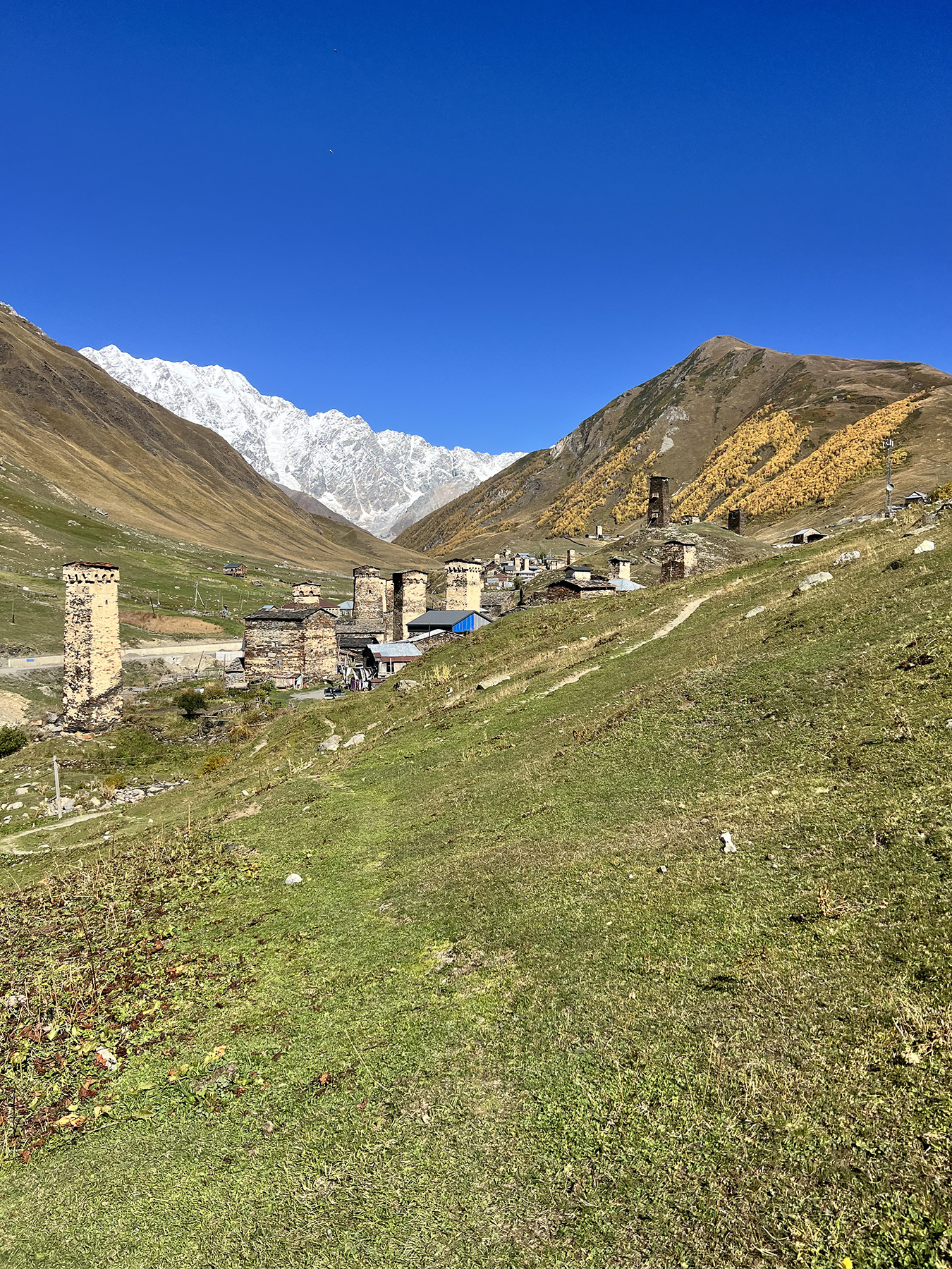 Gruzijska gorska vasica Ushguli z razgledom na najvišji vrh Gruzije – Shkhara. Foto: Katarina Kadivec